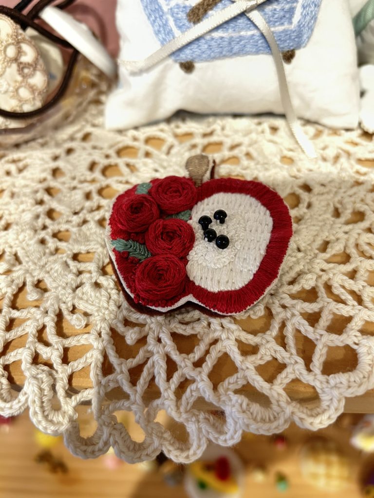 こちらのりんごは様々な刺繍の方法で作られているんですよ🎵