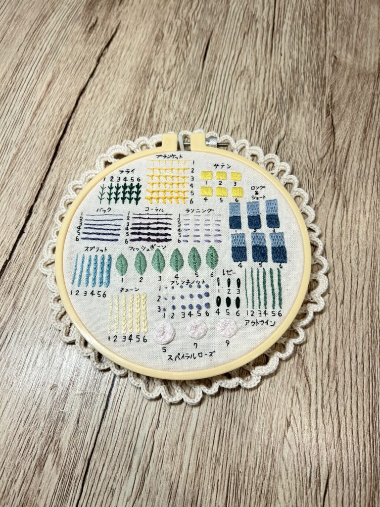 サテンステッチやロング&ショートステッチなど、基本の刺繍がずらりと並んでいますね!