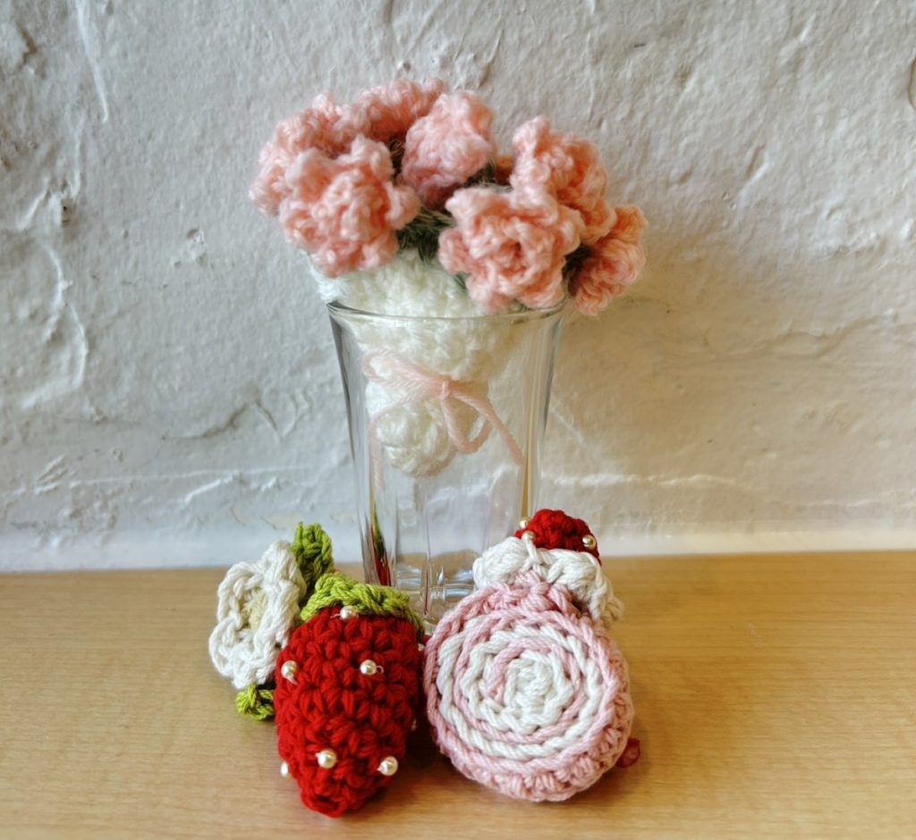 かぎ編みでブーケ、ロールケーキ、いちごを作っていただきました~✨